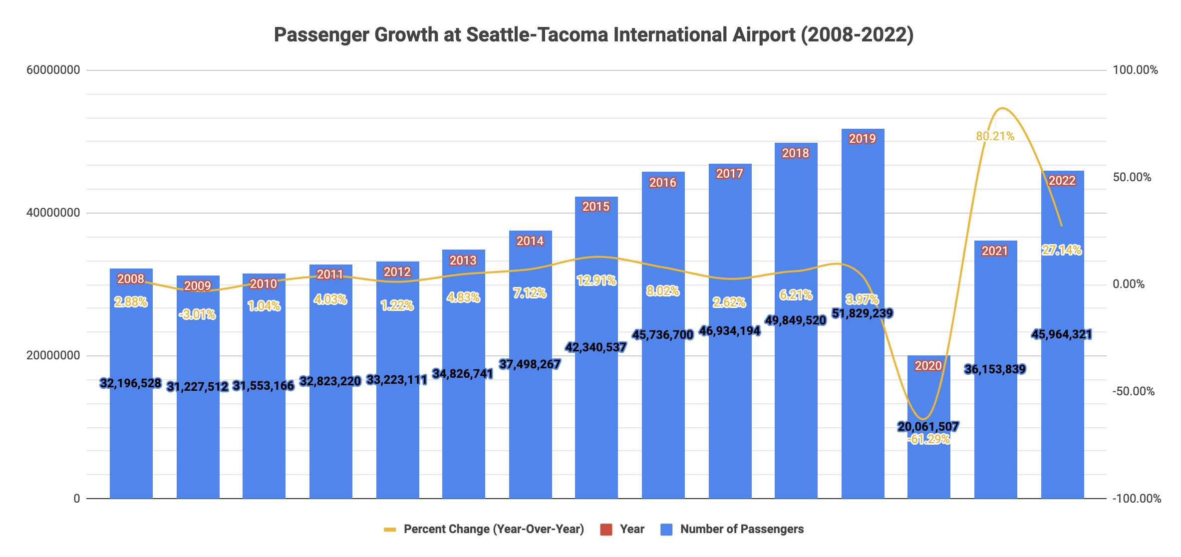 Passenger numbers ticked up in a big way at Seattle-Tacoma International Airport (SEA) last year. Total passenger counts jumped 27% year-over-year and topped 45,964,321 in 2022, which is comparable numbers last seen in 2016. Prior to the pandemic, the airport reached a record of 51,829,239 passengers in 2019 and was seeing yearly increases of about 4% during the 2010s. Commercial air travel seems headed toward to pre-pandemic levels as leisure travel booms and business travel resumes.