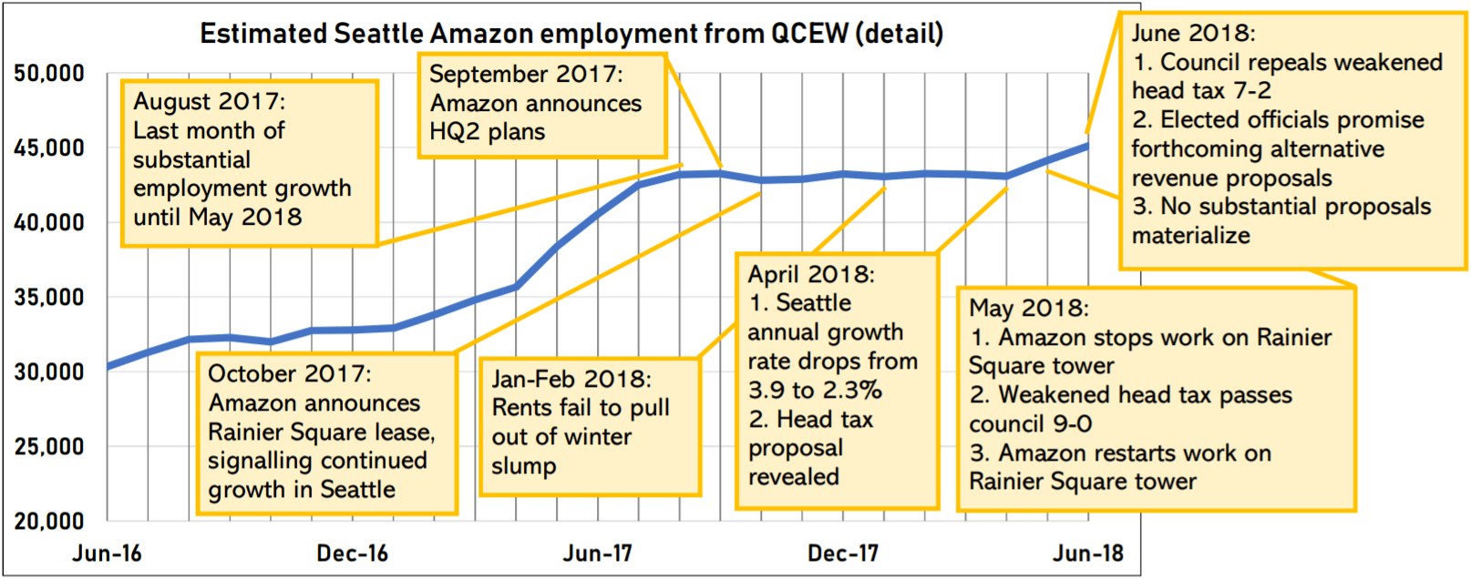 • In early May 2018, Amazon stopped work on the Block 18 office tower and threatens to sublease the Rainier Square tower each intended for thousands of corporate employees in an unambiguous signal to city leaders: tax us and we stop hiring. The number of local corporate employees had hardly budged in nine months.