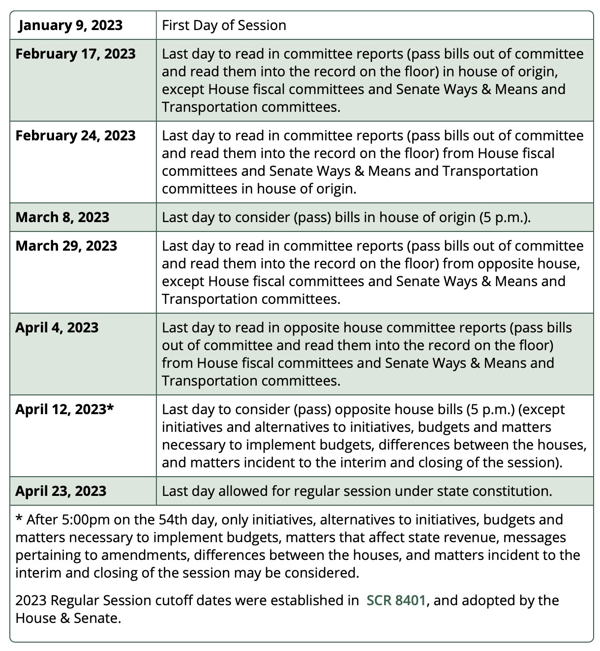 There are five more cutoffs scheduled for the legislative session starting with next week’s fiscal committee cutoff. By March 8th, bills need to be out of their house of origin, then the process flips to the other chamber.