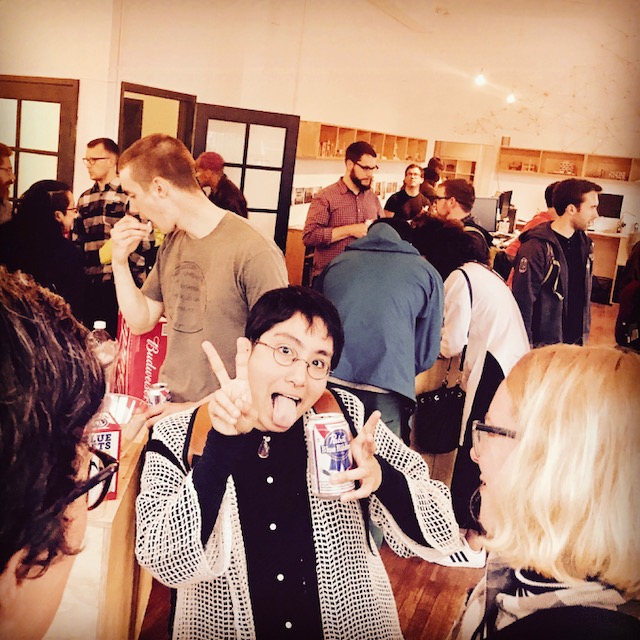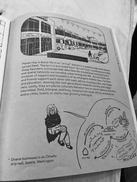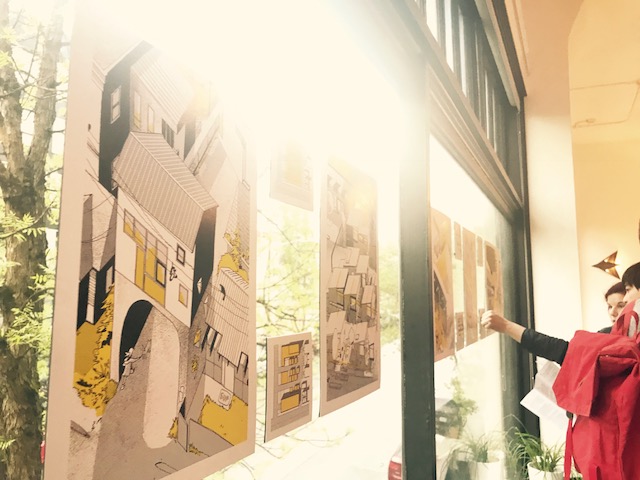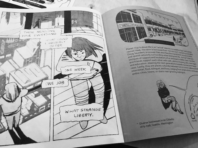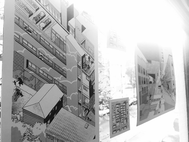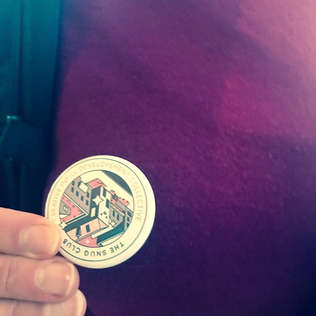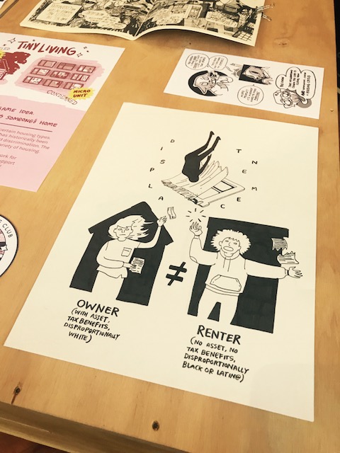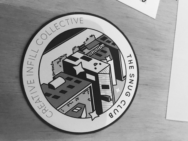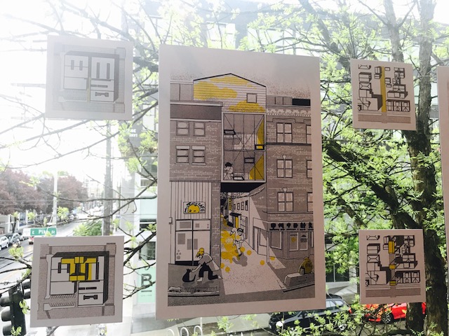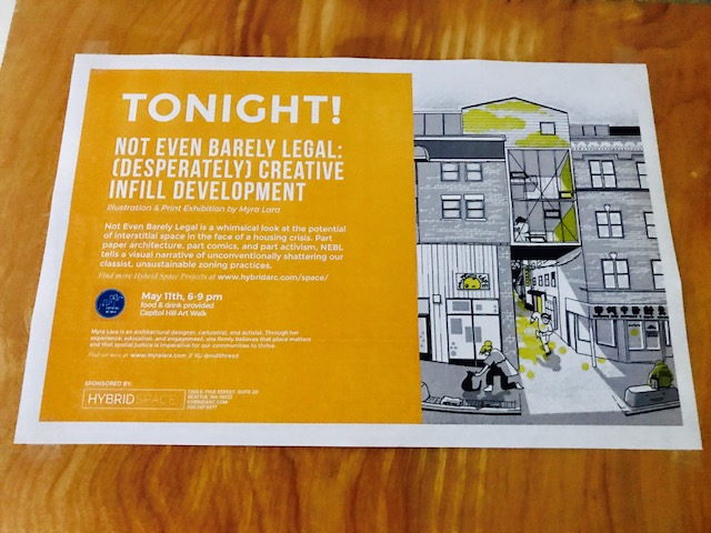 Local queer, Latinx artist Myra Lara held a very well attended art opening at Hybrid_Space last week. Not Even Barely Legal: (Desperately) Creative Infill Development included a mix of architectural sketches, comics, and is grounded in activism. Myra Lara is a thoughtful, talented artist who is foucsed on education and advocacy for spatial justice. The art exhibit was a fantastic intersection of accessible entry points for people to think about zoning, maybe for the first time. It also included some urbanist inside jokes that would satisfy any policy wonk. For example, she designed an exclusive “snug club” wearable patch. I found this to be a fun tongue and cheek allegory to counter to existing neighborhood groups, themselves often exclusive groups that perpetuate exclusionary zoning of big lot detached single-family​ homes. Instead of watching a dry presentation about converting parking to housing, Lara demonstrated the possibilities through using the color yellow to highlight current use versus future use of limited land in our cities. Lara told The Urbanist that she is working to “reframe the conversation” about what it means to share the city. She wants to “make it accessible through making it visually interesting. Alex Brennan, a Capitol Hill renter, quipped, “This exhibit says everything I want to say about Seattle, but better!” Another attendee said, “I’d never thought about this before. It made me think about (the housing crisis) differently.” Housing policy is full of difficult jargon, counterintuitive relationships, and if you finally become confident enough to advocate for changes, city government is quite intimidating to access. Lara’s art exhibit is an example of how people’s imaginations can be engaged to spur action. When you’re new to thinking about how to grow our cities, conversations feel exclusive and off putting to non-wonks. Seattle urbanists often talk about welcoming communities; Myra Lara’s exhibit was one of the most welcoming urban planning events I’ve attended. Learn more about Myra Lara www.myralara.com // @nullthread // Support the artist by donating here. Check out the exhibit through June 2nd at HyBrid_space. HyBrid_space is located at 1205 E Pike St, # 2D (upstairs).