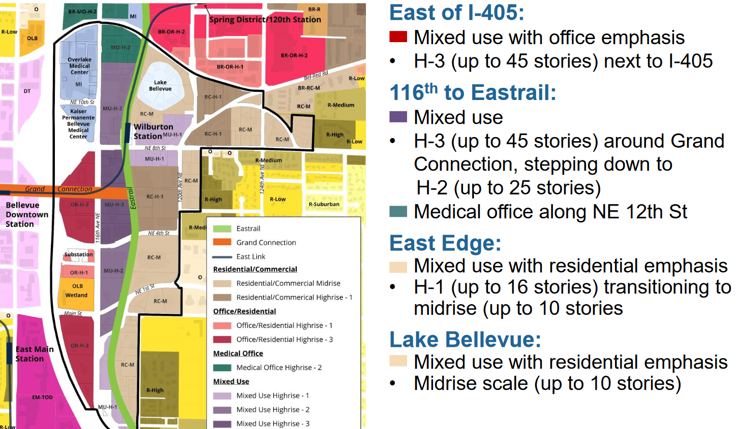 The Planning Commission’s recommended alternative for this neighborhood was pretty bold, and it remains so in its implementation by Council. When fully built out, the tallest buildings would be located near I-405 and centrally around the Grand Connection and Eastrail. Radiating away from there, buildings would gradually decrease in height to smaller sized towers and midrise buildings as one proceeds to the east of Eastrail.