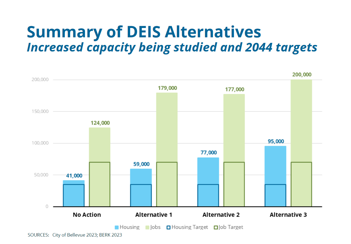 In the Draft EIS, three different alternatives were created to assess different levels of housing capacity, with Alternative 1 providing for the least amount of additional capacity and Alternative 3 for the most. The alternatives also differed at a conceptual level in how the growth would be distributed across Bellevue, with each subsequent alternative building off of the previous one.