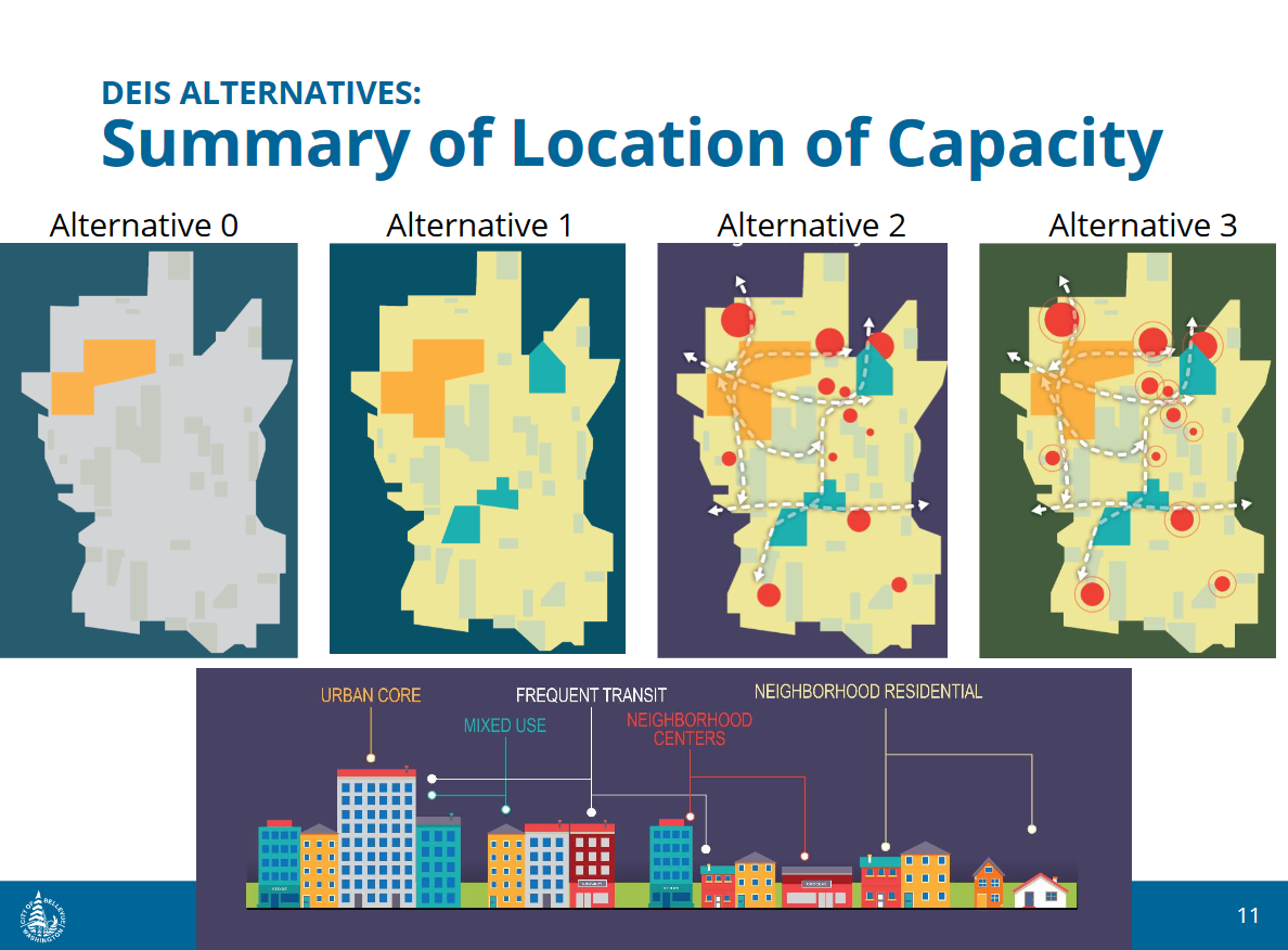 Staff have not yet publicly released a final land use map that reflects Council’s changes to the Planning Commission’s recommendation, so it’s still unclear just how much housing capacity is allowed for under the body’s approved Preferred Alternative. What is clear is that, after the Final EIS is completed in the fall, Bellevue City Council will be required to craft a land use map that reflects some combination of the four alternatives thus far evaluated. This leaves a wide range of possibilities, with housing diversity and significant capacity allowed throughout the city on one end of the spectrum and minimal growth that largely maintains the status quo on the other.