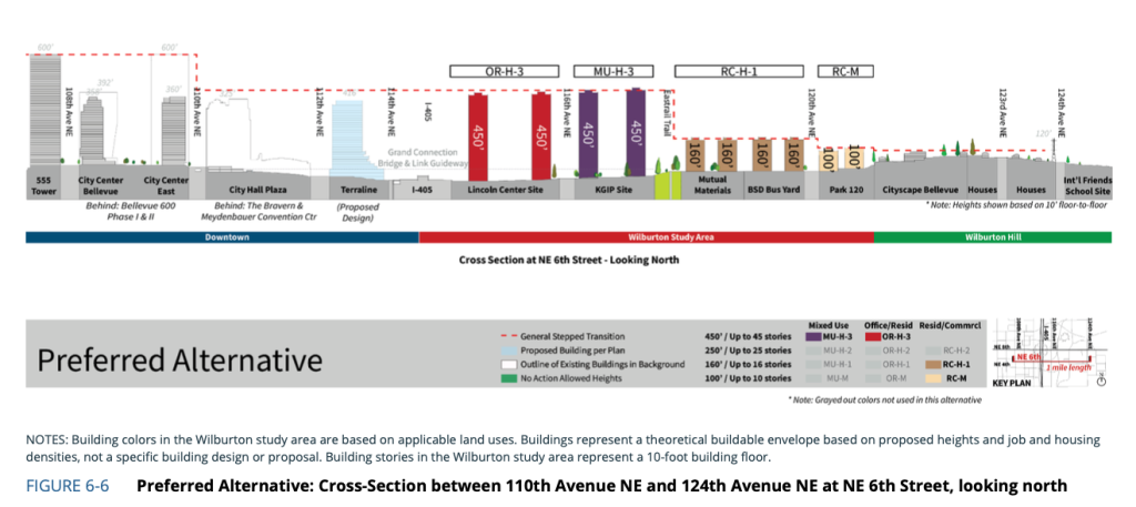 Beyond Wilburton, the preferred growth strategy would also allow more highrises near the Spring District, BelRed, and Wilburton stations serving the BelRed and medical districts with wedding cake zoning stepping down from around 25 stories to 16 stories and then to midrise and lowrise heights.