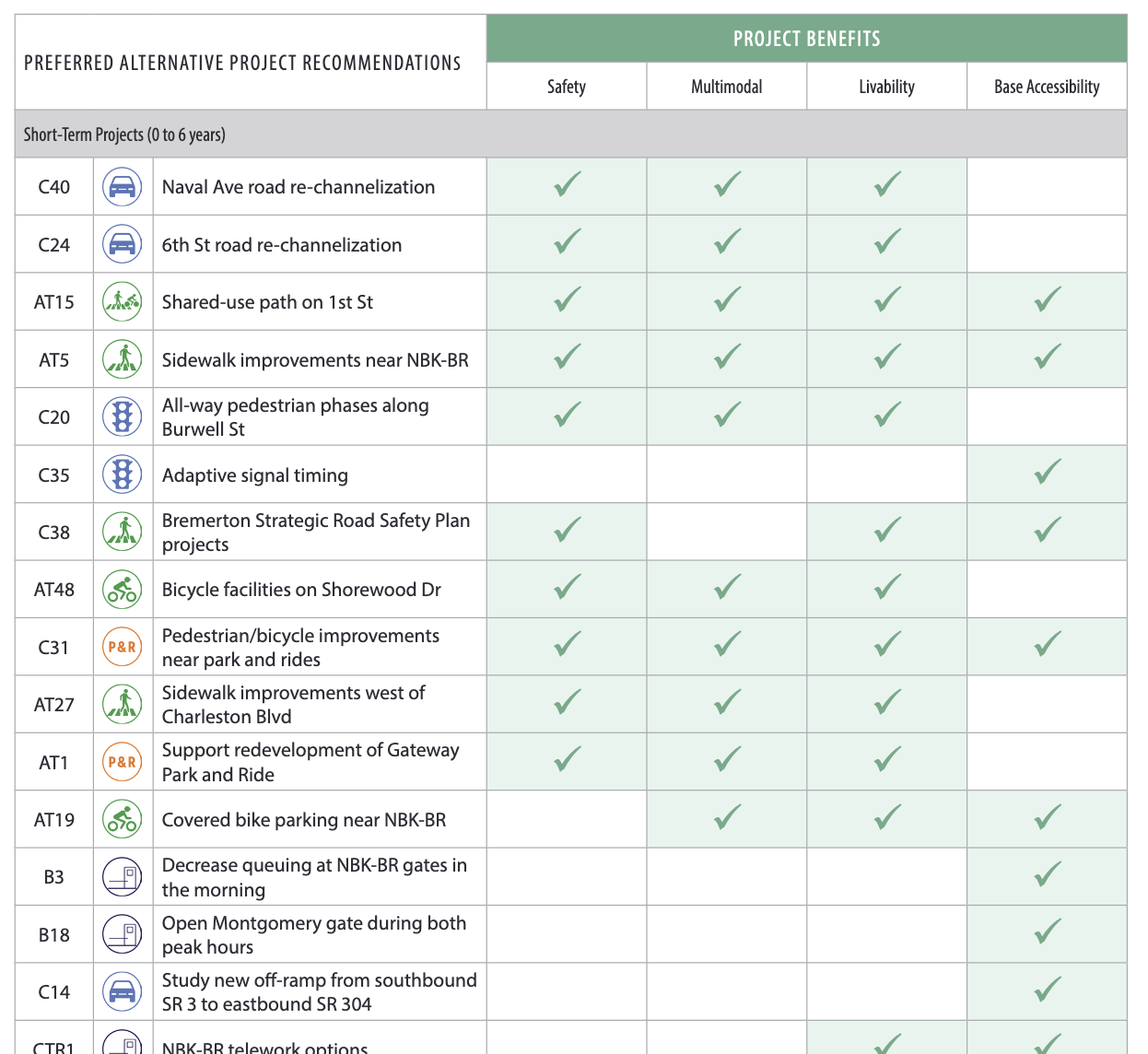 Next, the JCTP study contains a very long list of infrastructure projects, ranked according to cost and difficulty. Happily, the majority of the highest scoring projects are focused on transit, safe walking and the bike network. Caveats abound: Not every project listed has equal merit, much less funding — a fancy study isn’t the same as a new sidewalk, etc. But there’s no question that the Preferred Alternative is well-aligned with the high-ranking future infrastructure projects — and all that stuff will improve ‘livability’ in Bremerton.