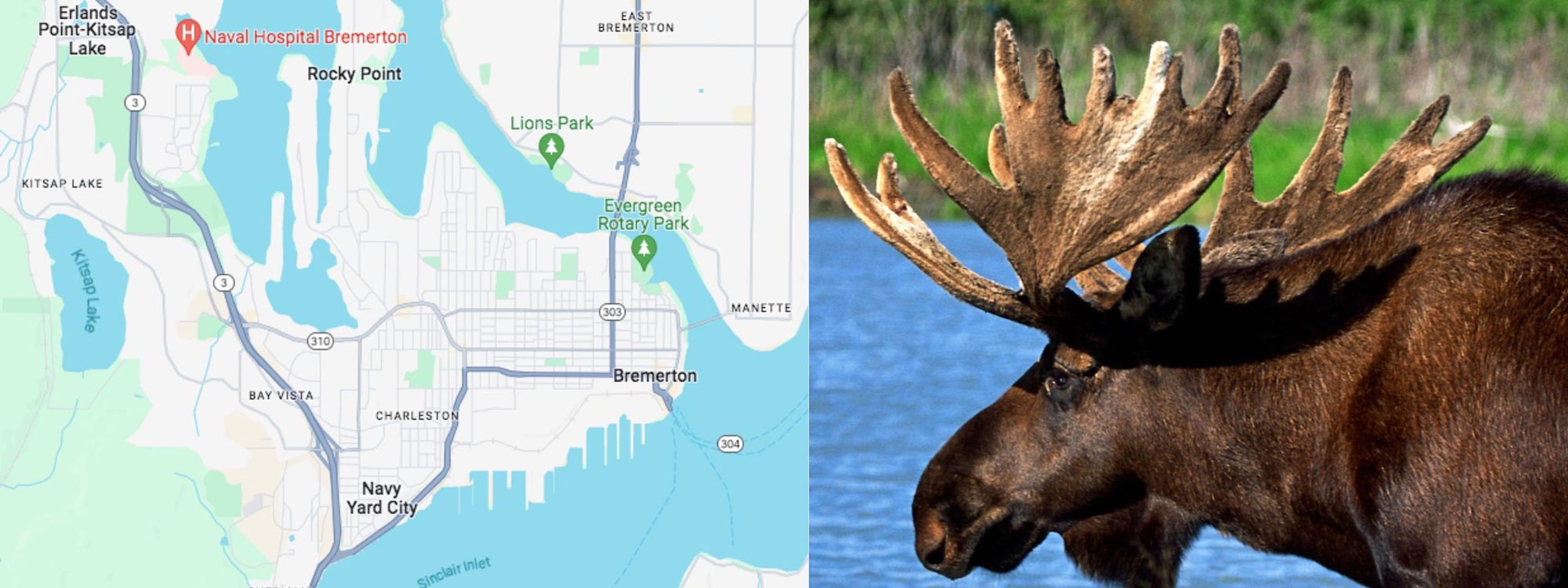 Central Bremerton is a moose-shaped peninsula. (Google Maps, Canva Clipart)