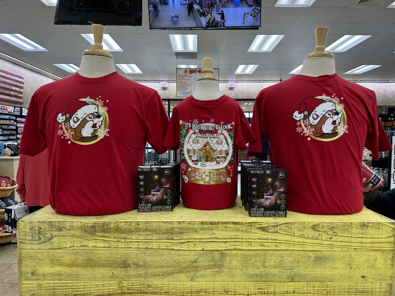 The holidays come to Buc-ee’s as the mascot beaver appears on countless Christmas shirts. (Ray Dubicki)