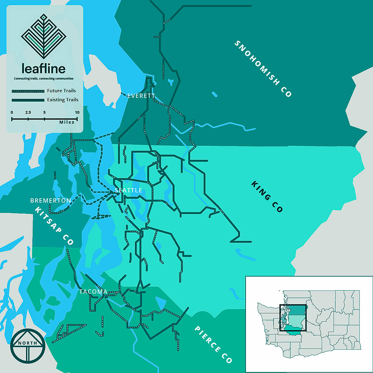 Improvements are coming, however, and in recent years, there is a new effort to expand and unify the loosely connected system of bike trails all over the Puget Sound region which is collectively being organized under an umbrella group called the Leafline Trails Coalition. Part of this effort is to also tie together modes of transit so that getting around, including to outdoor recreation, is easier by foot or bicycle.