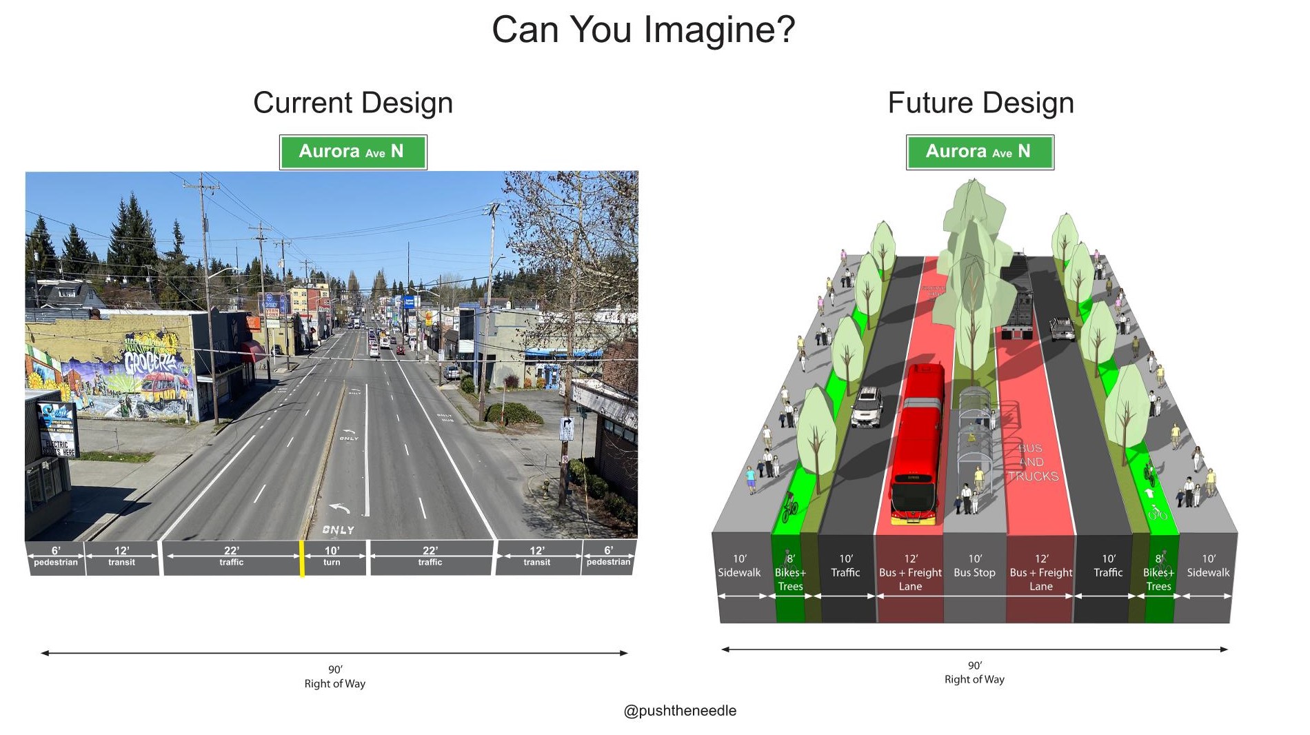 Narrowing motor vehicle space provides SDOT the opportunity of a lifetime. Imagine having tree-lined, protected bike lanes adjacent to wide sidewalks serving outdoor dining and comfortable storefronts along this densifying corridor. That won’t happen with a six or seven lane Aurora Avenue N. It’s clear that giving more than 20 feet of space back to the public traversing outside of a motor vehicle provides many options for safe and sustainable transportation in the future.