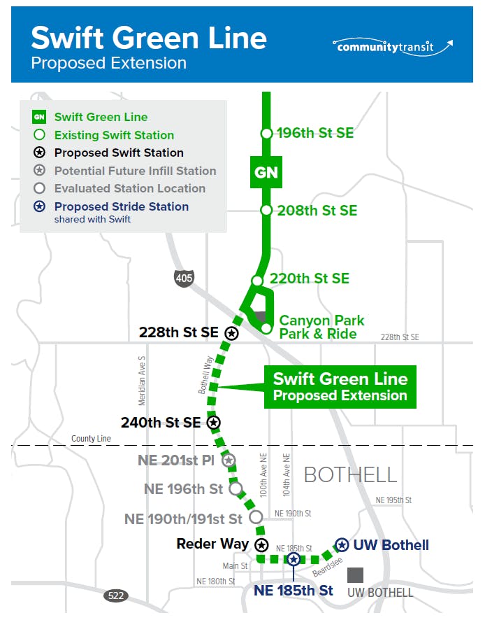 As for the Swift Green Line, Community Transit plans to extend the line deeper into Bothell to serve the city center and University of Washington Bothell/Cascadia College campus. The line currently terminates in the Canyon Park area. The extension is planned to provide up to six station pairs. Locations being evaluated include: