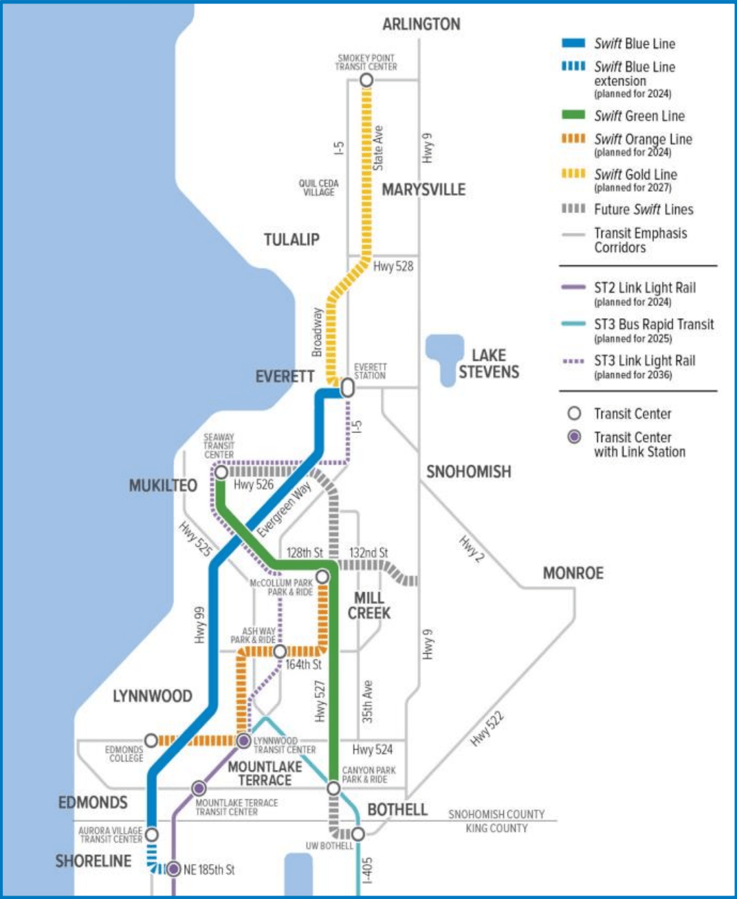 As for the Swift Orange Line, it will run from Mill Creek to Edmonds Community College via Ash Way Park & Ride and Lynnwood Transit Center. It will be a crowning transit piece in the year that Link light rail is extended to Lynnwood. Community Transit is also planning to extend the Swift Blue Line to the NE 185th St Station in Shoreline in 2024, too. It’s especially unique because it will be providing limited local service in King County even though most of the benefit is to Snohomish County riders. That extension will also serve Aurora Village Transit Center in Shoreline.
