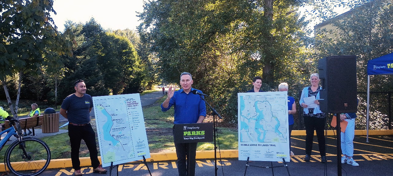 County Executive Dow Constantine touted the ability of trail users to connect to light rail at Sound Transit’s planned Marymoor Village Station, which will open with the extension of light rail into downtown Redmond in 2025. (Ryan Packer)