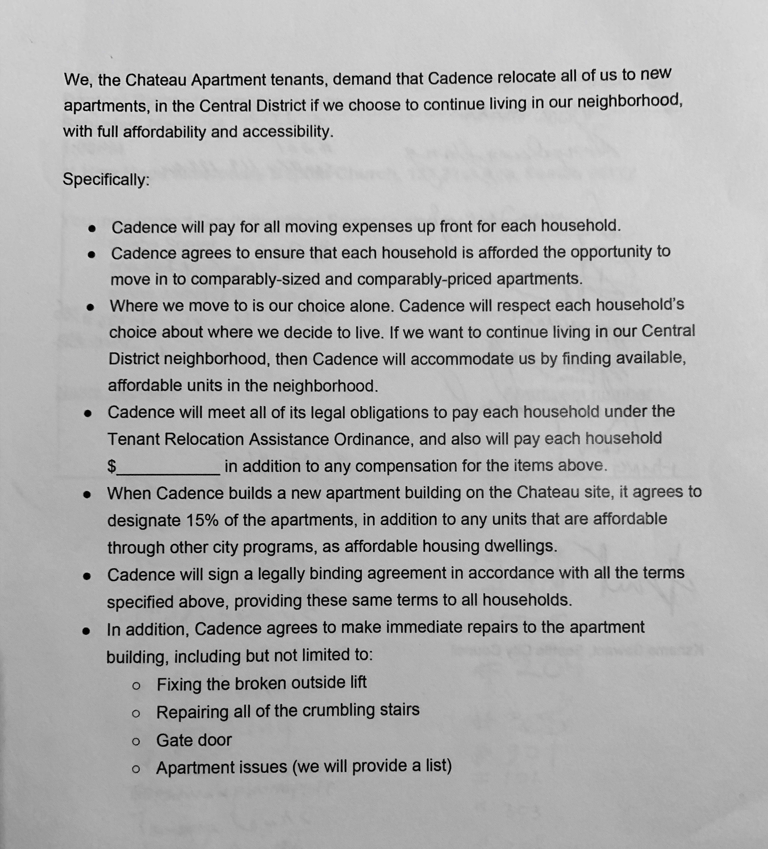 Since the story of the Chateau Apartments hit the media a few weeks ago, the tenants have engaged in discussion with the building’s new owners, Cadence Development, which have promised to increase tenants’ relocation expenses.