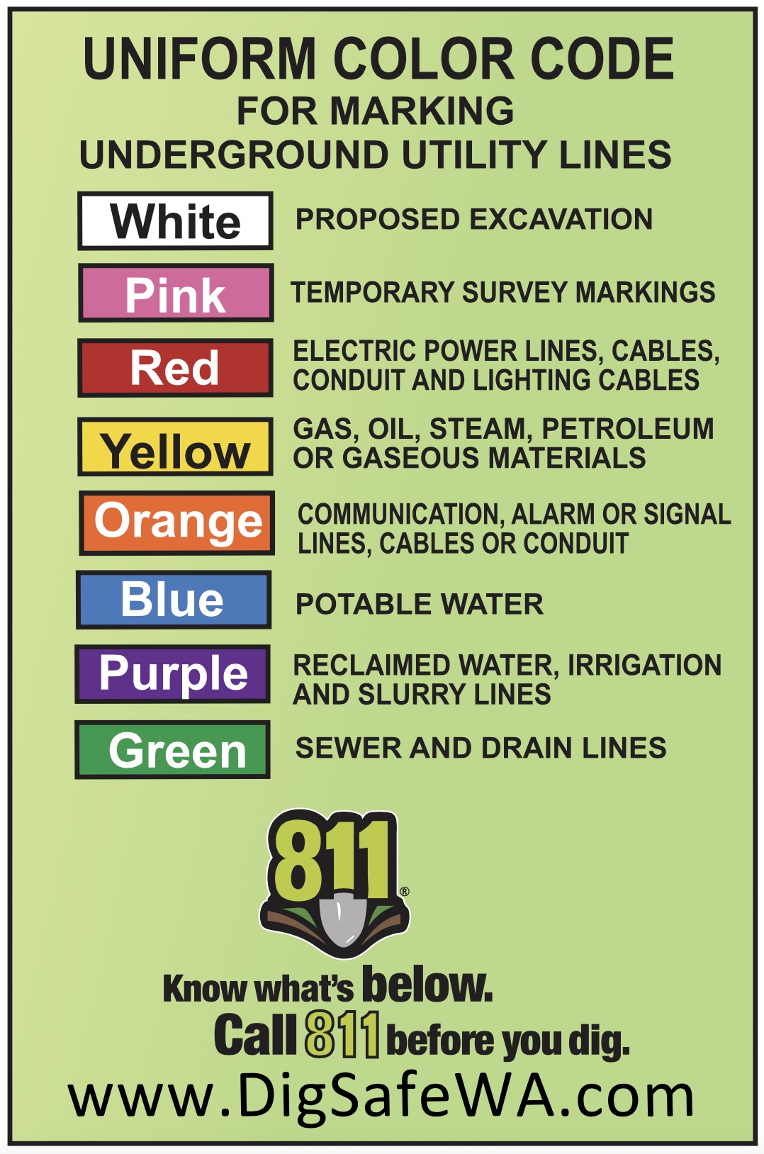It is state law to call 811 before digging. There is no minimum excavation depth to avoid calling, and Szczes points out that they mark for realtors who are putting in For Sale signs. Better safe than sorry as the outcome of failing to identify utility lines are fines, along with the cost of repairs and damages should a utility be struck. And really, there is no reason for such peril, since Washington’s 811 system is simple and effective. And hopefully clear, now that we know what those colors mean.