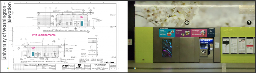 The latest plans show Sound Transit will mostly receive wall-mounted digital screens, though some could be be floor-mounted like one slated for SeaTac/Airport Station near the airport exit. These models appear to be 75″ screens that are set in the portrait fashion. Many could end up at platform levels while others could be located on mezzanines and main entrance areas. Drawings suggest that the digital screens shouldn’t heavily impact station artwork, but they could wind up in locations ready-made for future ticket vending machines (though usually leaving an extra slot for another ticket vending machine).