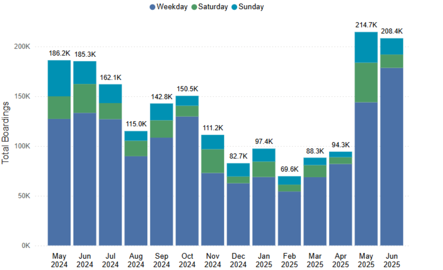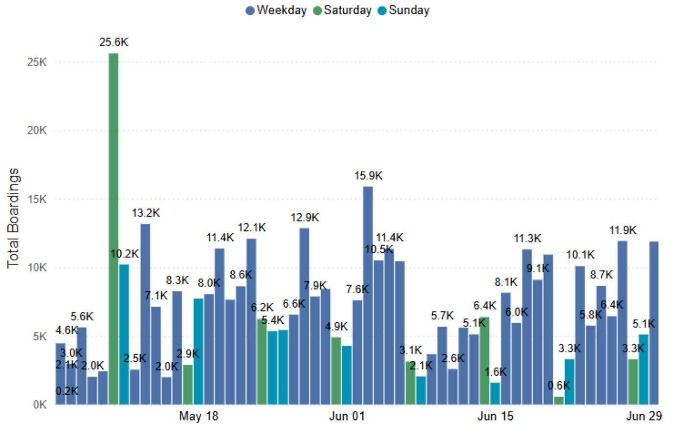Meanwhile, 1 Line ridership has been climbing as well, averaging more than 100,000 daily boardings since April and hitting a new high of 109,262 daily boardings in June. Previously, October 2024 had been the only month to exceed 100,000 daily boardings.
