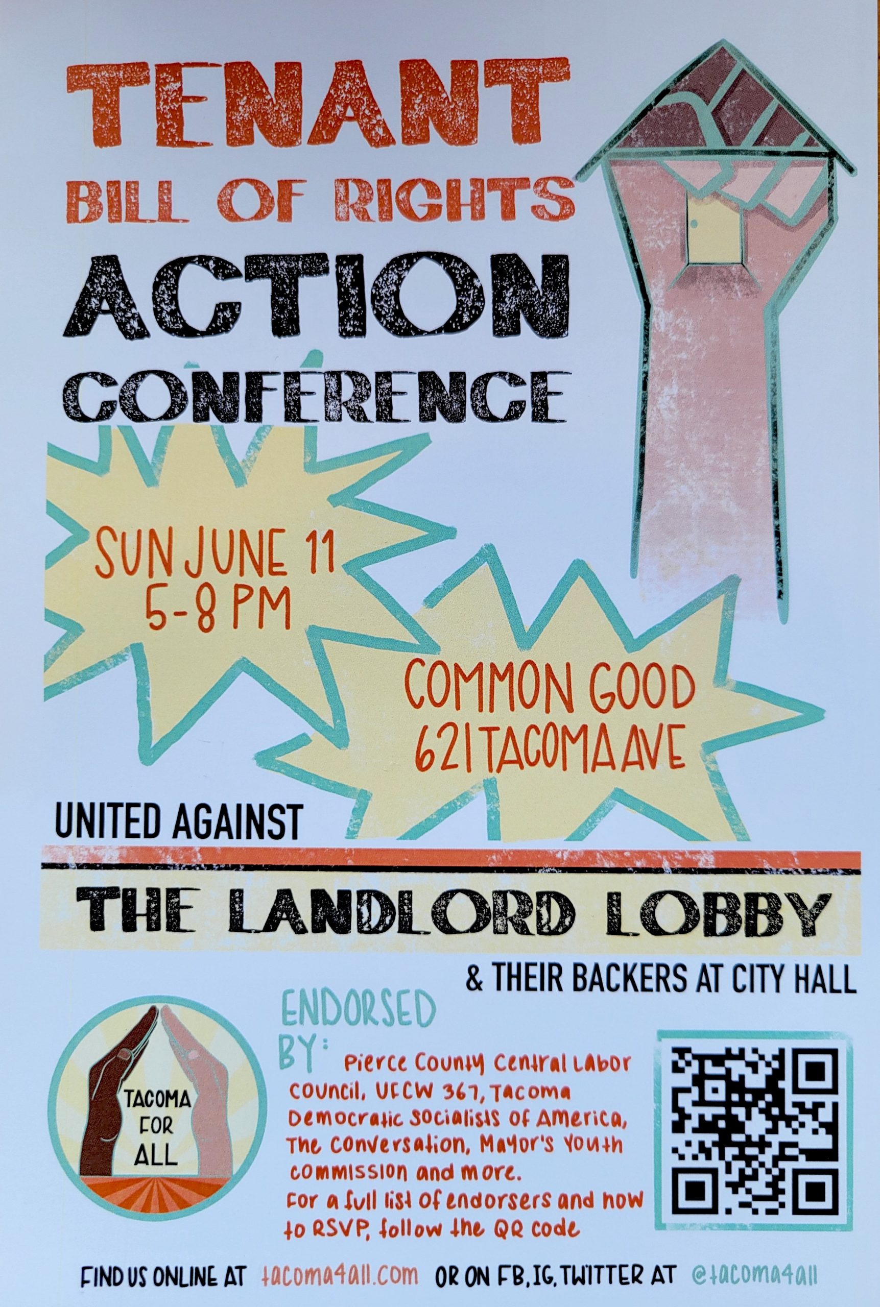 Poster of upcoming Tenant Bill of Rights Conference, Sunday, June 11, 5-8pm, at Common Good, 621 Tacoma Avenue.