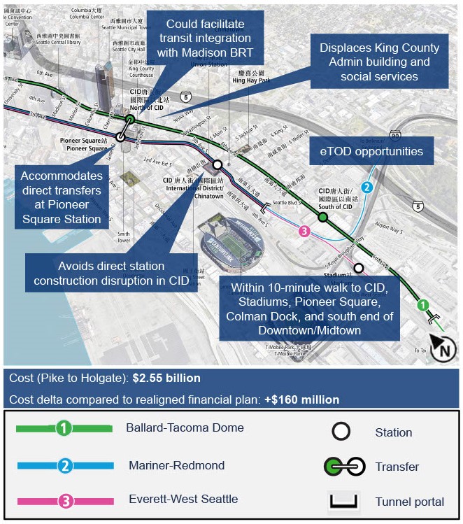 To their credit, one way that Sound Transit’s board have listened to community feedback is by eliminating the agency’s default option of putting the station at 5th Avenue S in its July 2022 vote. That disruptive option would have required demolishing several blocks in Chinatown’s historic district. That left only the 4th Avenue S options that Sound Transit said cost $700 million more than the Shallow 5th Alternative, which oddly remains the agency’s cost baseline off of which it based third-party funding demands even after it was eliminated. System Expansion Committee Chair Claudia Balducci has floated the idea of revising the CID baseline, but the idea may be controversial since it would likely add costs for all four of Sound Transit’s subareas.