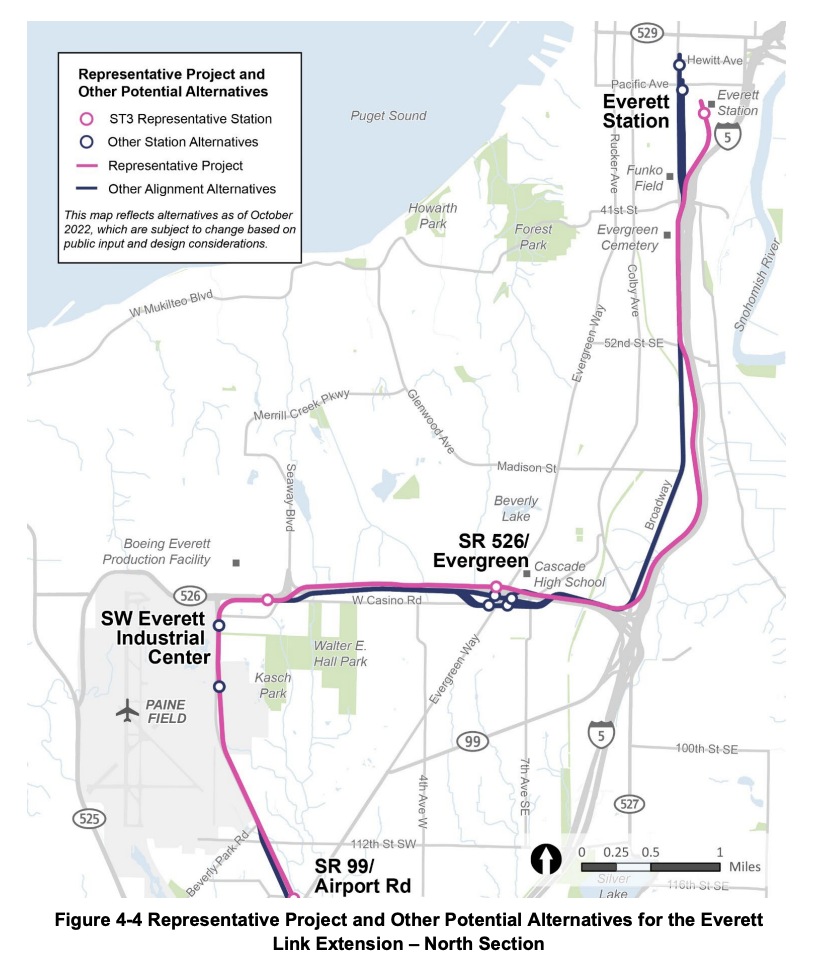 - Study complete alternatives to the Boeing Deviation in South Everett that include alignment options on and near I-5 to SR 99 with multiple station locations, community enhancements like trails and public spaces, and new connecting bus services;
