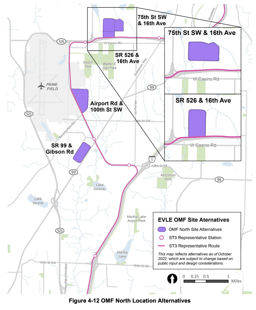 Before wading into the messy background of how consideration of potential SR 99 and I-5 alternatives were cut, the issues with that, and feedback to send to Sound Transit, let’s dive into two peripheral but vital pieces of the alternatives on the table which include potential Operations and Maintenance Facility (OMF) North locations and the non-station alignment from SR 526 to Everett Station.