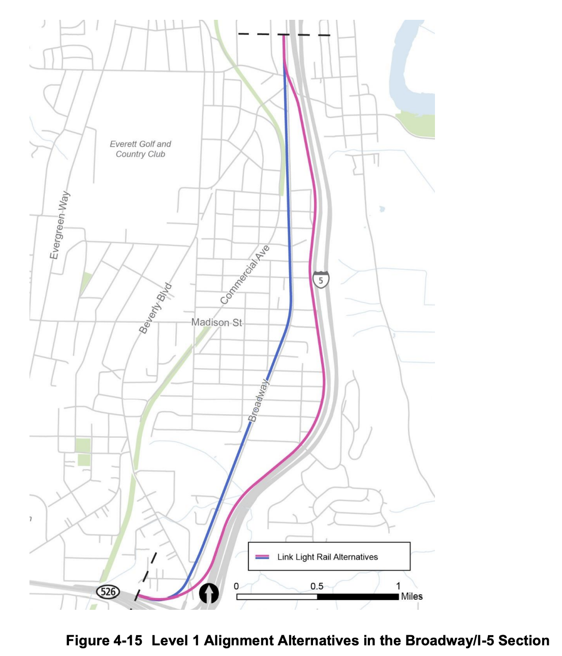 If Broadway is being studied, other alignments on Beverly Boulevard/Colby Avenue and the Interurban Trail may be worth considering, too. Such an alignment could wind its way toward Everett Station on approach to 52nd Street SE or 41st Street and eventually directly serve neighborhoods in between with a station or two. The cost difference between the two principal alternatives is only about $100 million with Broadway the more expensive one, but that could be a very worthy expenditure to buy a corridor that could actually serve riders in the future with extra stations.
