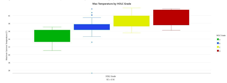 Figure 1. Maximum Temperature increases with redlining (HOLC) grade. Green areas have the mildest temperatures.