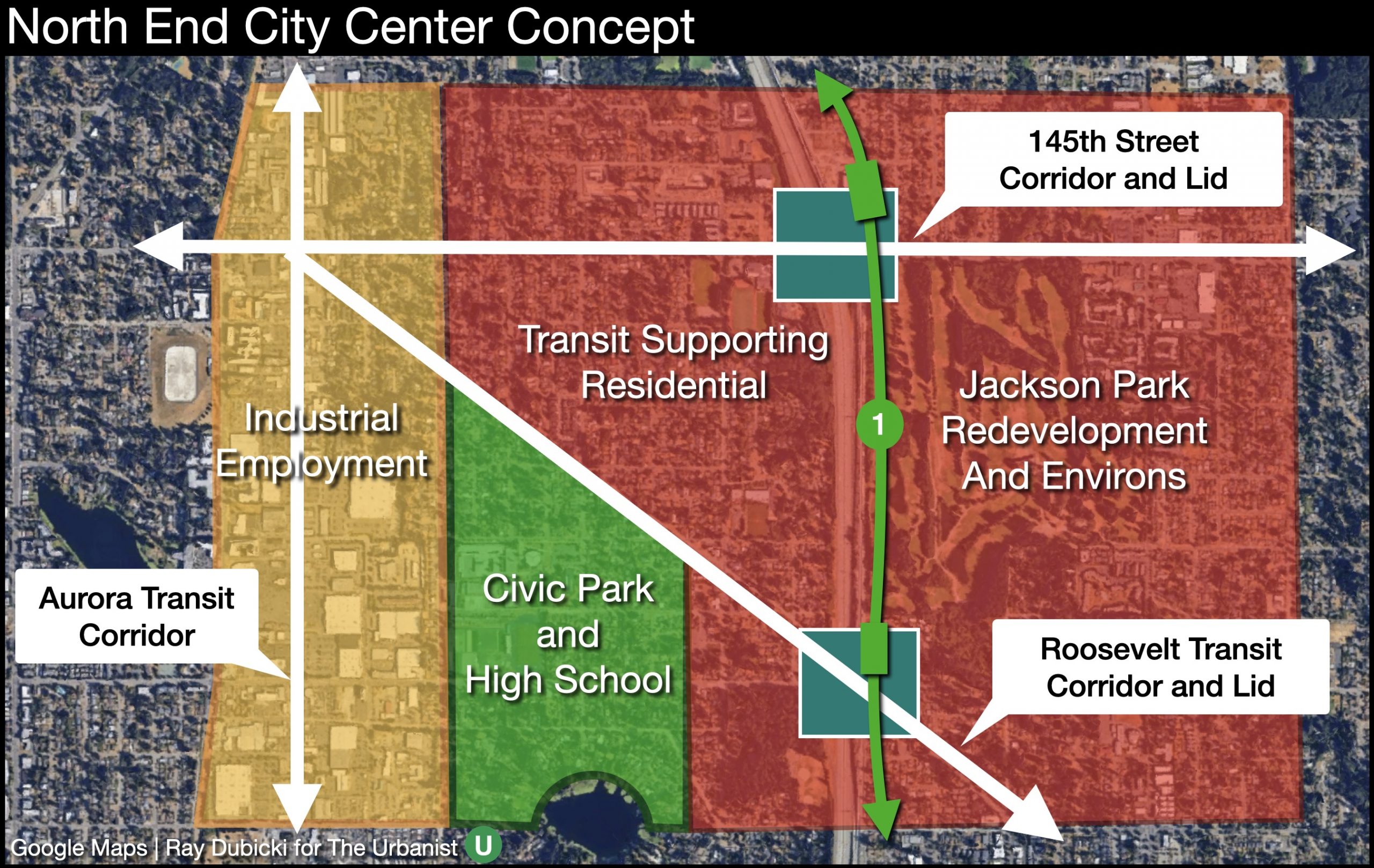 North End City use distribution concept to connect development at Jackson Park and the new light rail stations with an employment node on Aurora Avenue. Between the two would be infill development of housing dense enough to support the nearby transit investments and a civic park developed around Ingraham High School and Haller Lake. (Google Maps/Ray Dubicki)