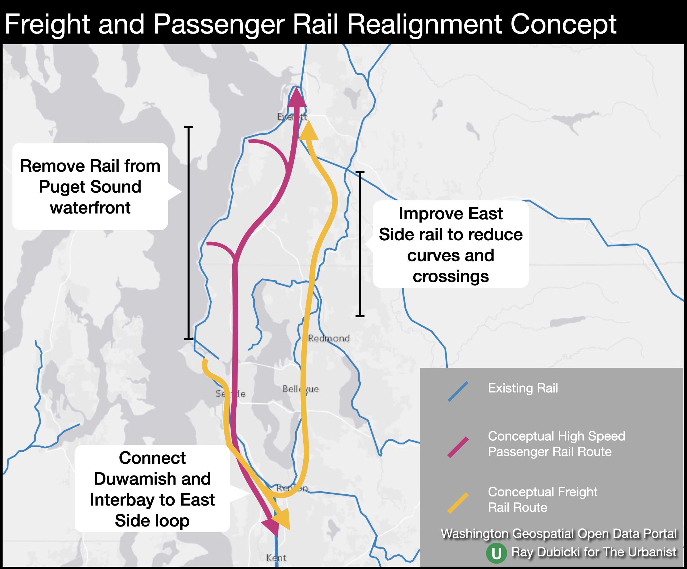 The second part involves far less visibility but far more difficulty. Preserving freight rail in the region is going to mean moving it inland. From Everett, trains could head directly south and wrap to the east side of Lake Washington before reconnecting with the existing lines in Renton. Trains to the Port of Seattle and the grain or maritime connections in Interbay can enter the city. As there are not oil depots in Seattle, the bomb trains would no longer need to go under downtown or past packed stadiums. Trains would also stop needing to roll across the Ship Canal and north Seattle’s entire coastline can be designated park land.