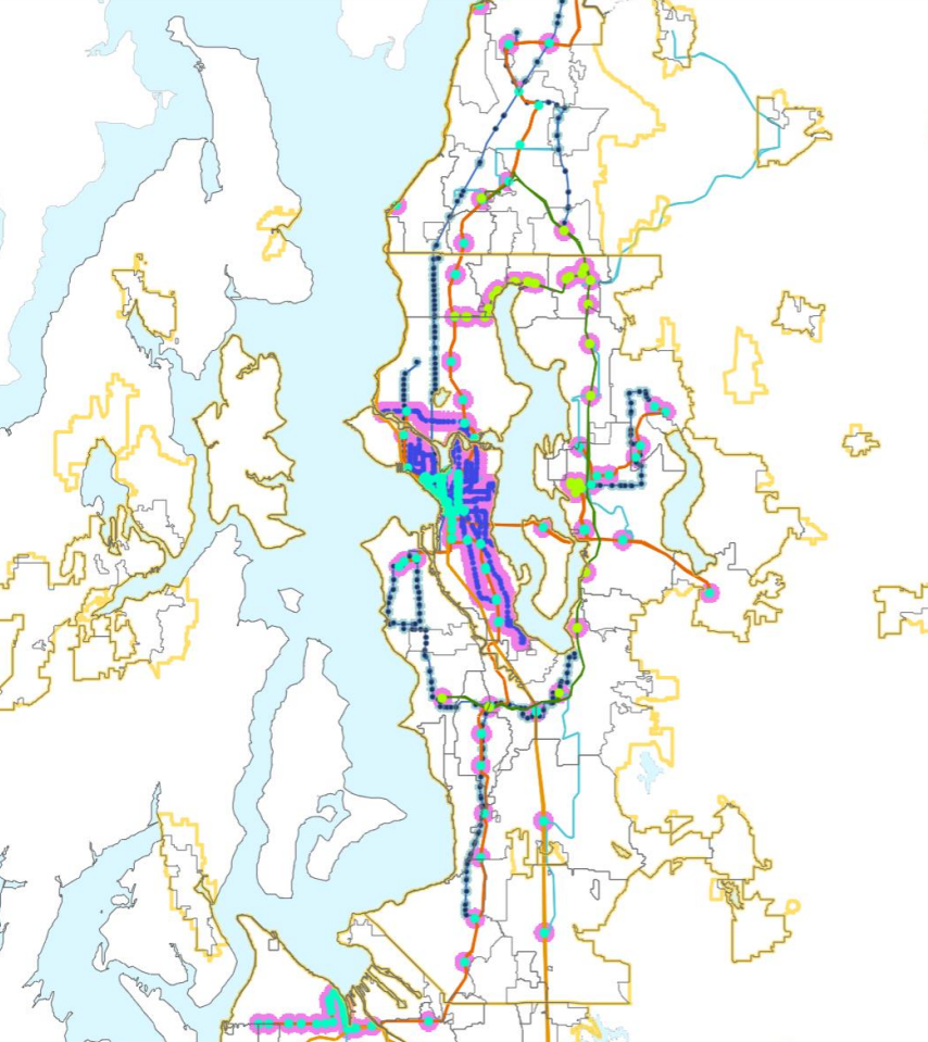 The transit-oriented development bill in 2024 is likely to only go after the areas around light rail and commuter rail stations, and to a lesser extent immediately around bus rapid transit stops. (PSRC)