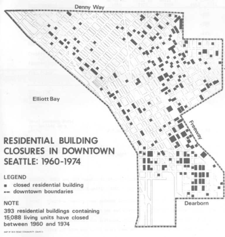 The outlawing of SRO buildings in Seattle led to the closure of an incredibly high number of housing units in and around downtown ahead of the 1974 date for compliance with the “Ozark Hotel Ordinances. (City of Seattle)