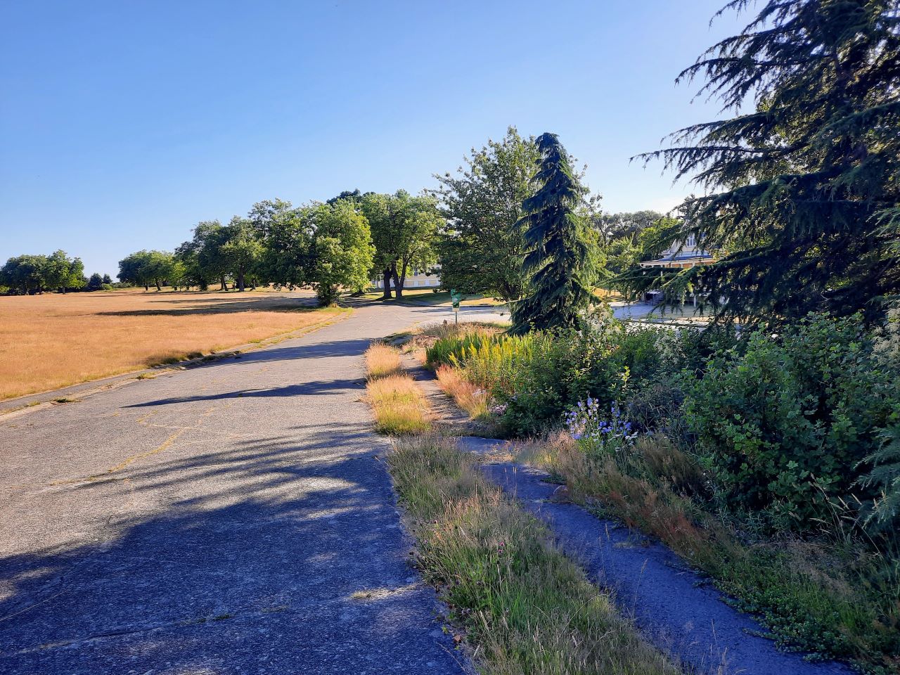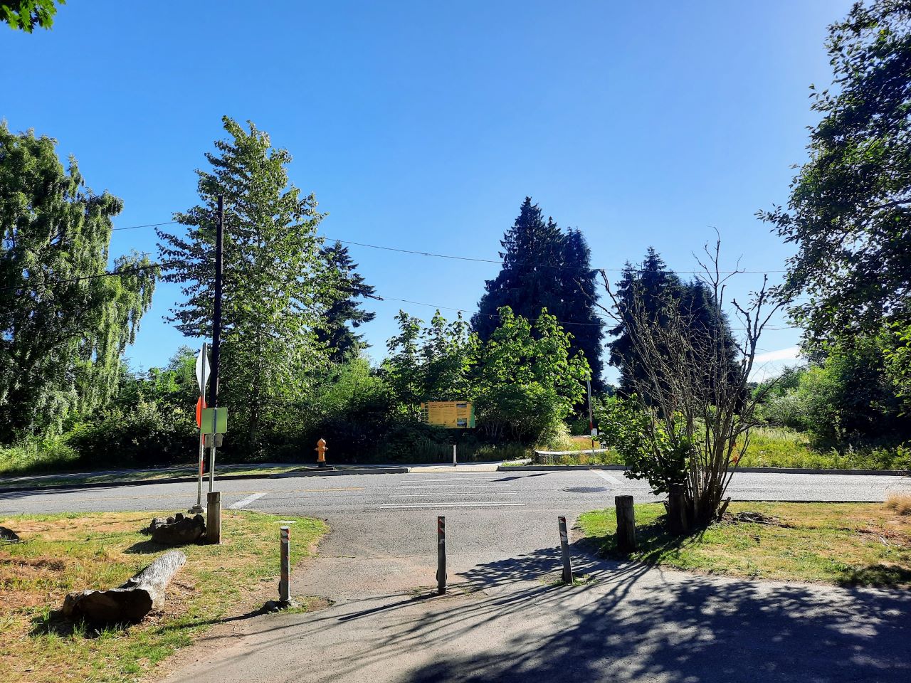 Bollards keep Texas Way car-free as it meet the Discovery Park Boulevard intersection. The boulevard winds down the bluff to the lighthouse. (Doug Trumm)