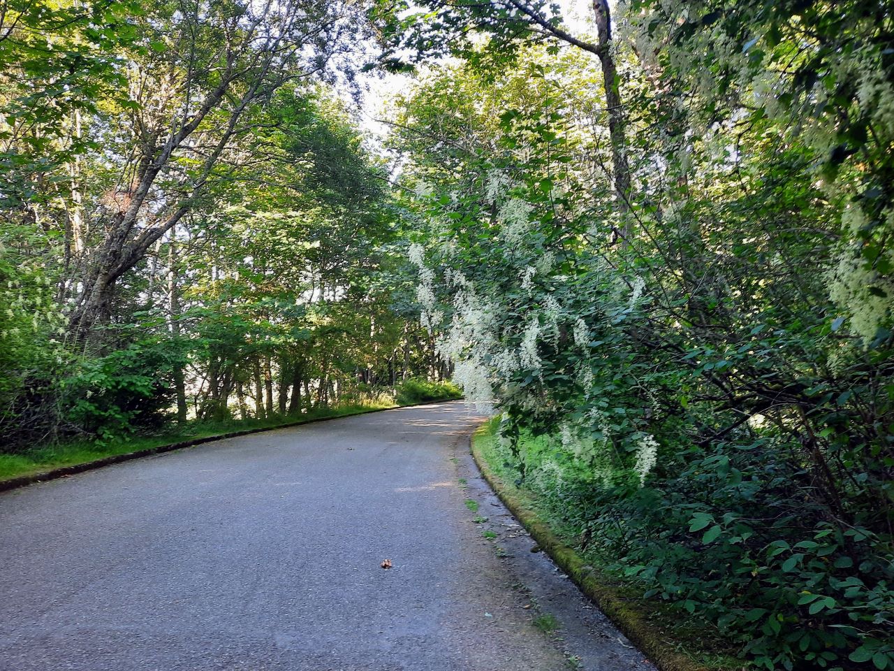 Here’s where the first hill climb begins, but luckily it is shaded by a thick (and currently blooming) canopy — plus this section of Texas Way is closed to cars so it’s quiet and peaceful. (Doug Trumm)