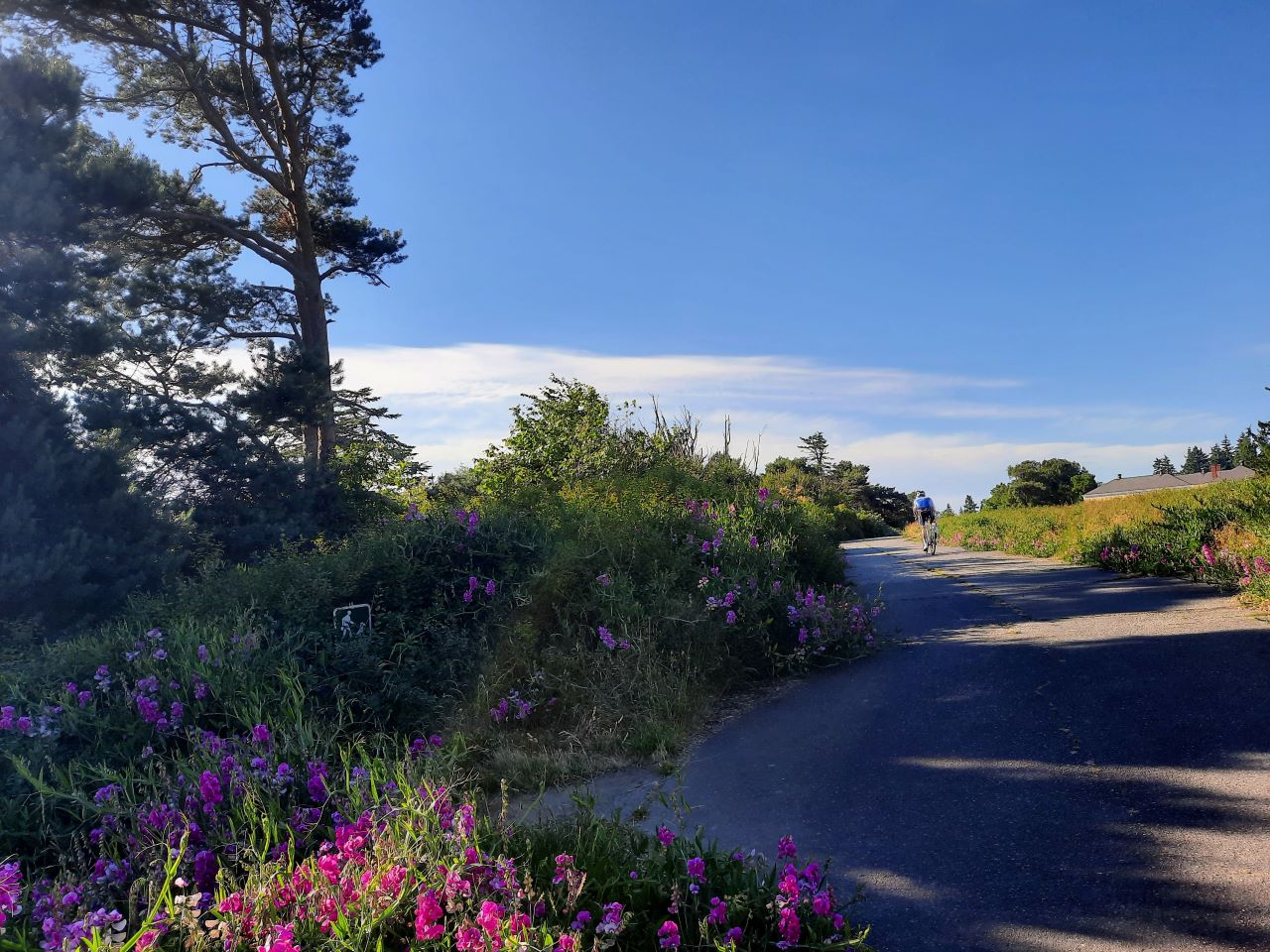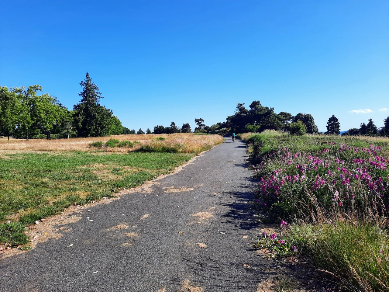 A ten-foot paved path with purple wildflowers and a cyclist and tree ridge in the distance.