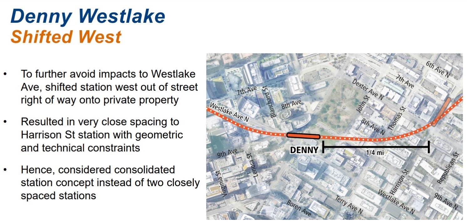 Major stakeholders are pushing to shift Denny Station west, which could lead to deletion of nearby South Lake Union Station and delay the project with further study.