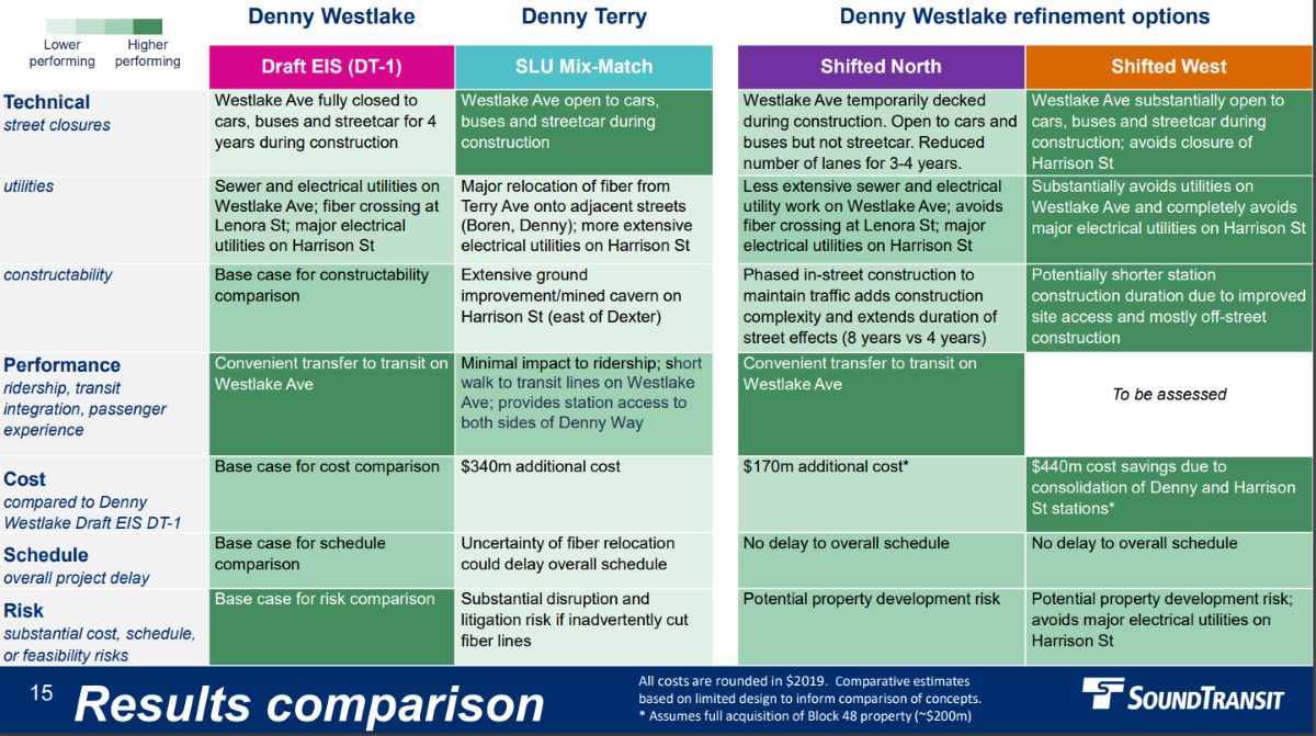 The Shifted North alternative would entail a $170 million increase in costs over the Westlake baseline, according to Sound Transit estimates. Meanwhile, the agency revealed the cost for the Terry alternative is now projected at $340 million more than the baseline alternative due to additional work related to construction mitigation and relocating a major fiber (high speed internet) line serving the area. The Shifted West alternative saves $440 million, but only by jettisoning an entire station that was projected to serve 10,500 daily riders.