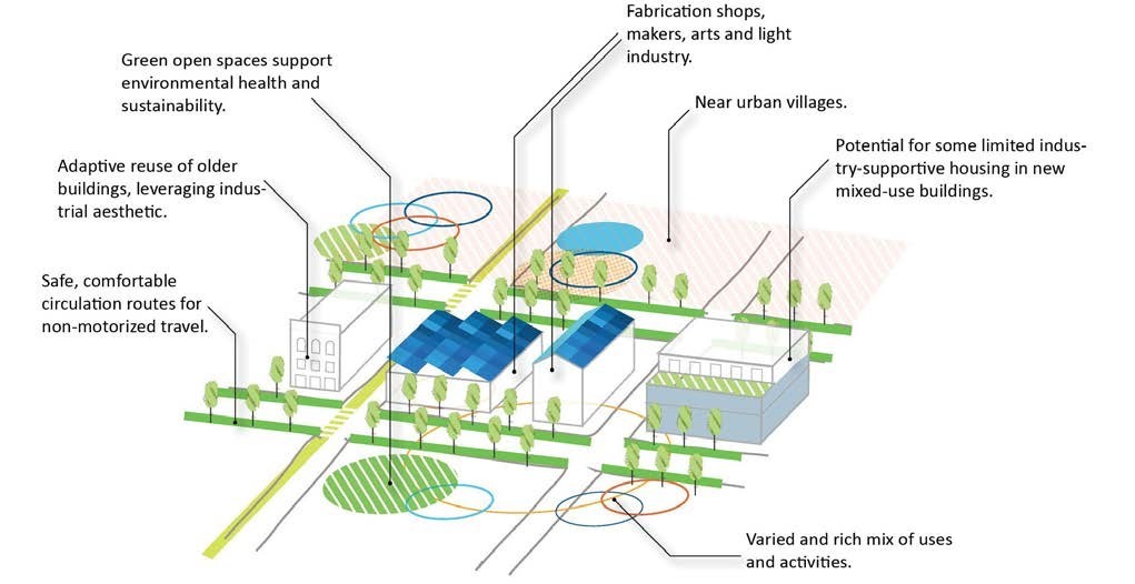 - Industry and Innovation: “This zone would encourage new development in multi-story buildings that accommodate industrial businesses mixed with other dense employment uses such as research, design, offices, and technology through a system of density bonuses. Modern industrial development would support high-density employment near Sound Transit light rail stations and commercial areas. ”