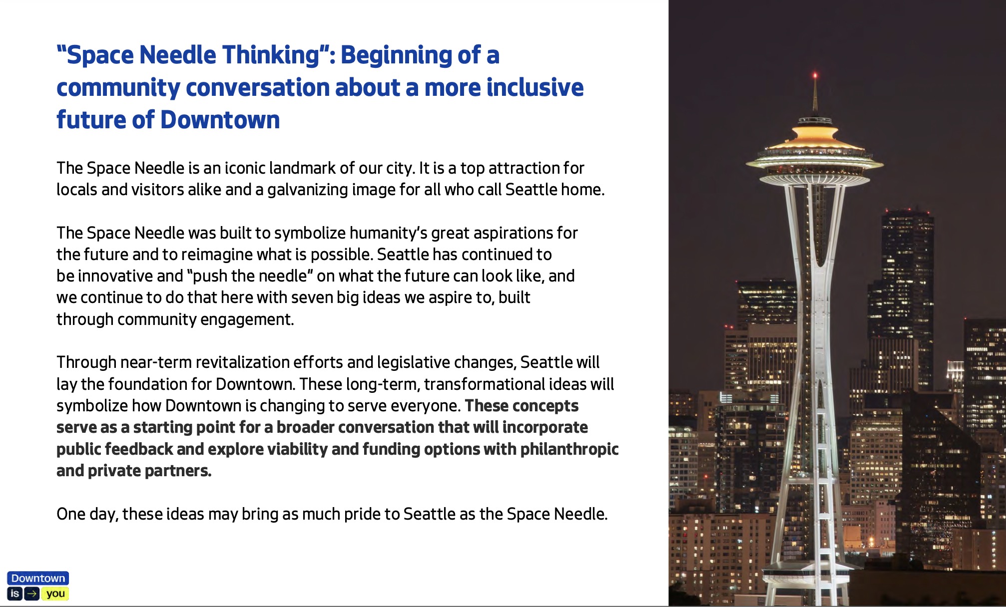 Space Needle Thinking from Seattle’s Downtown Activation Plan. Current ticket prices at the Space Needle are at least $30 for adults and $25 for children. (City of Seattle)