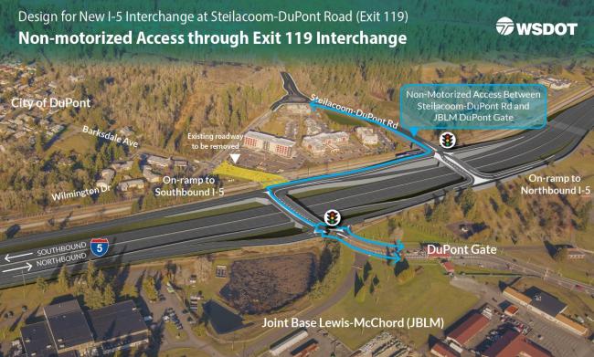 “At this location, Sound Transit’s crossing gates and signals have been badly damaged by vehicles running through the gates several times since we rebuilt the rail line,” Johnson said. “WSDOT’s proposed project will construct a new grade-separated bridge over both I-5 and Sound Transit’s rail lines, which will connect to Steilacoom-DuPont Road. The at-grade crossing at Barksdale Avenue will be removed along with a short segment of the roadway.”