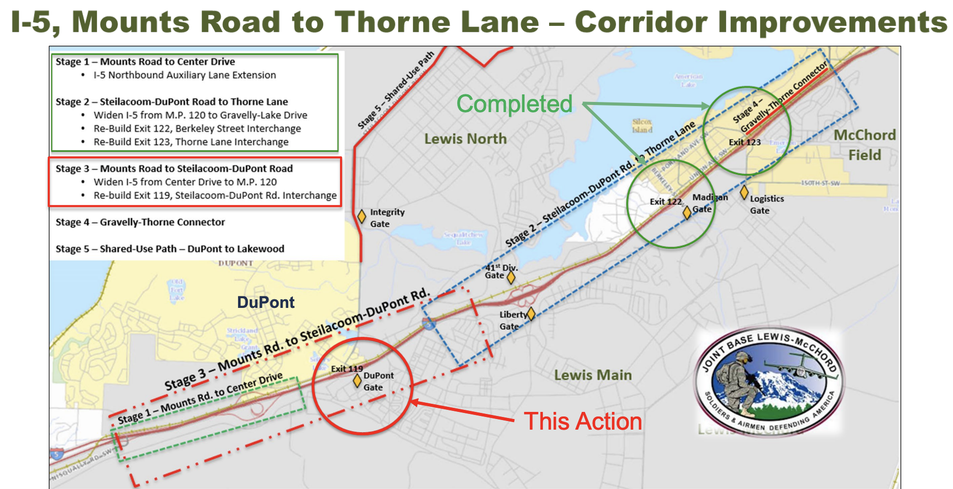 This is not the first such project to make changes that benefit the Lakewood Subdivision. “WSDOT’s I-5/JBLM project has already complete two I-5 interchange rebuilds,” Johnson said. “Each one removed an at-grade crossing of Sound Transit’s rail line.”
