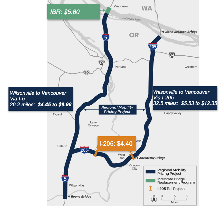 The regional mobility pricing program will charge drivers based on the distance they travel on I-5 and I-205, with rates varying by time of day. To illustrate the approximate range of expected tolls along I-5 and I-205, we’ve used Google Maps to compute the distance between the Boone Bridge in Wilsonville and the two freeway bridges across the Columbia River. The I-5 route between Wilsonville and the Interstate Bridge is 29.5 miles long. At 17 cents per mile, the toll would be $4.45; at 38 cents per mile the toll would be $9.96.The I-205 route between Wilsonville and the Interstate Bridge is 32.5 miles long. At 17 cents per mile, the toll would be $5.53; at 38 cents per mile the toll would be $12.35.