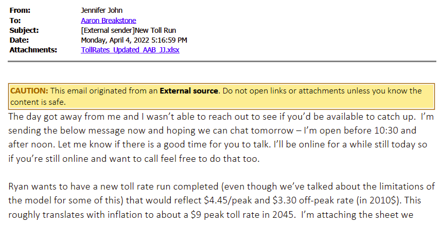 City Observatory has obtained internal WSDOT and ODOT planning documents that show that the IBR project is looking at peak hour tolls of up to $5.69 each way at the peak hour for the new interstate bridge. Here is an April 4th, 2022 email from Jennifer John (a transportation modeler for the IBR project) to Aaron Breakstone (a transportation modeler for Metro). It explains that they are studying tolls on the way, peak hour tolls of $4.45 (in 2010$).