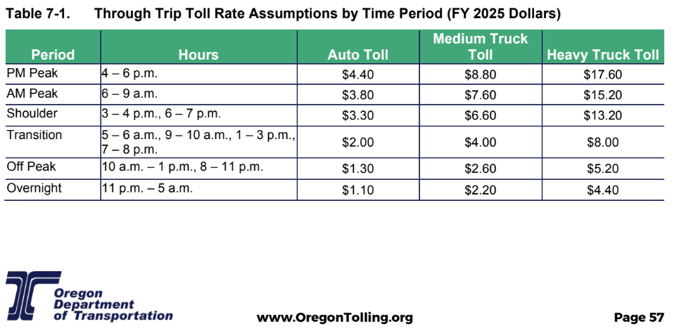 As we’ve said, ODOT has been very secretive about toll levels. We obtained the toll level estimates from a variety of ODOT documents. They include the following: