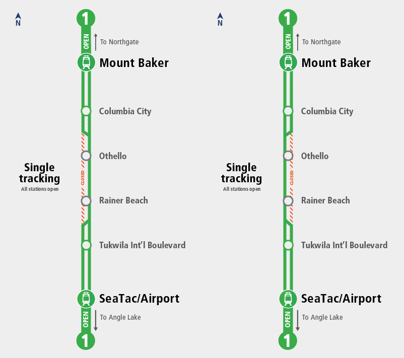 In the summer, the agency carried out several phases of maintenance work to repair sinking tracks in SoDo and replace platform tiles at Othello and Rainier Beach stations. Service impacts from the work was fairly severe with systemwide frequency reduced to every 20 minutes during track repairs and every 15 minutes during tile replacement. The agency blamed lower-than-planned frequencies on a variety of factors, including signal systems when operating on a single track in the reverse direction. Trains also had to operate on a long 1.5-mile segment of single track since crossover tracks are only located north of Othello station and south of Rainier Beach station. Clearing that whole segment takes time, especially with two station stops along the way.