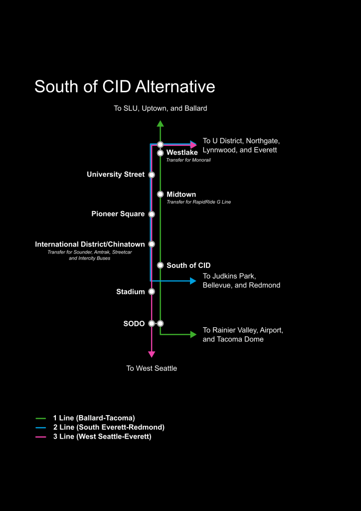 As Link expands to Bellevue, then West Seattle and Ballard, the current straight line followed by light rail will be divided. Trains from Ballard will go through a new downtown tunnel to connect to the existing line at SODO and continue to SeaTac/Airport and Tacoma Dome as Link 1 Line. Trains from Bellevue and Redmond will enter the city at the existing Chinatown-International District (CID) station and continue through the existing downtown tunnel all the way north to Lynnwood as Link 2 Line. Trains from Everett and the north will share that track and transit tunnel, then branch at SODO to West Seattle as Link 3 Line. Any trip switching between tunnels would best occur at Westlake or Union Station. Removing the Union Station option and shifting the vital transfer deep into downtown results in significant ridership-impacting delay.