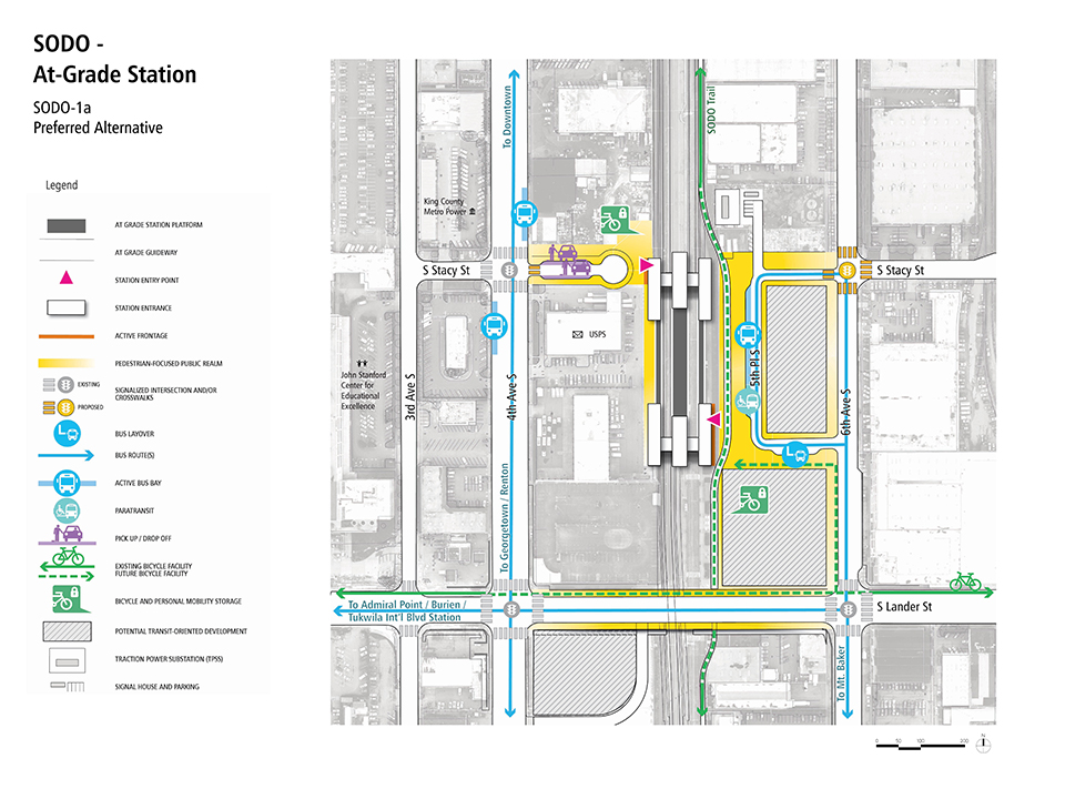 The SODO Station plans envision a double station complex in the middle of the SODO Busway. The 1 Line would take over the existing tracks and a new set of tracks would be constructed on the west side of the busway for the 3 Line. In the process, Sound Transit would build entirely new station facilities.