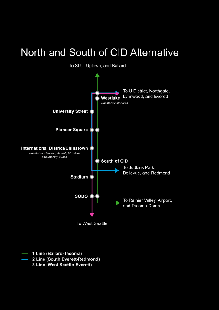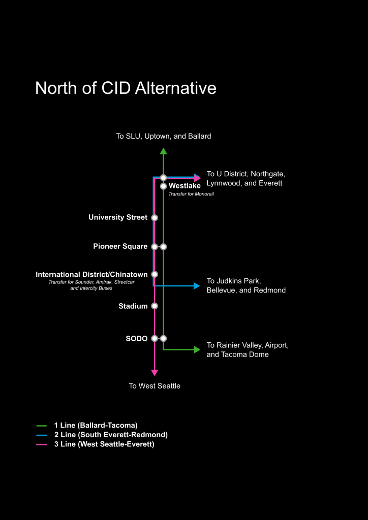 As Link expands to Bellevue, then West Seattle and Ballard, the current straight line followed by light rail will be divided. Trains from Ballard will go through a new downtown tunnel to connect to the existing line at SODO and continue to SeaTac/Airport and Tacoma Dome as Link 1 Line. Trains from Bellevue and Redmond will enter the city at the existing Chinatown-International District (CID) station and continue through the existing downtown tunnel all the way north to Lynnwood as Link 2 Line. Trains from Everett and the north will share that track and transit tunnel, then branch at SODO to West Seattle as Link 3 Line. Any trip switching between tunnels would best occur at Westlake or Union Station. Removing the Union Station option and shifting the vital transfer deep into downtown results in significant ridership-impacting delay.