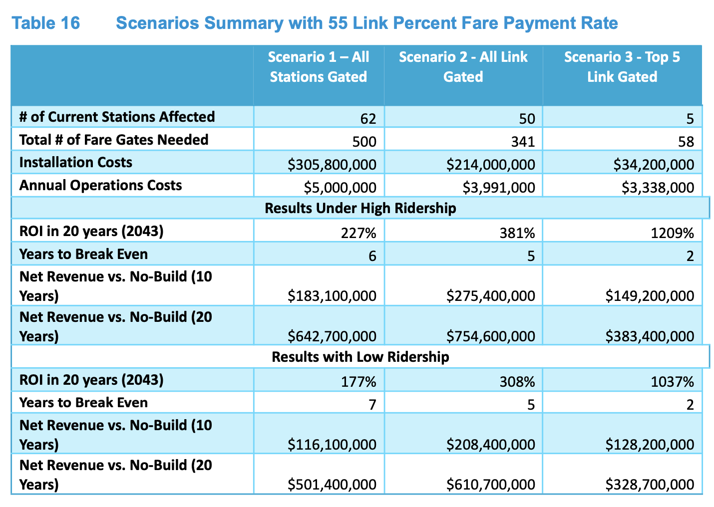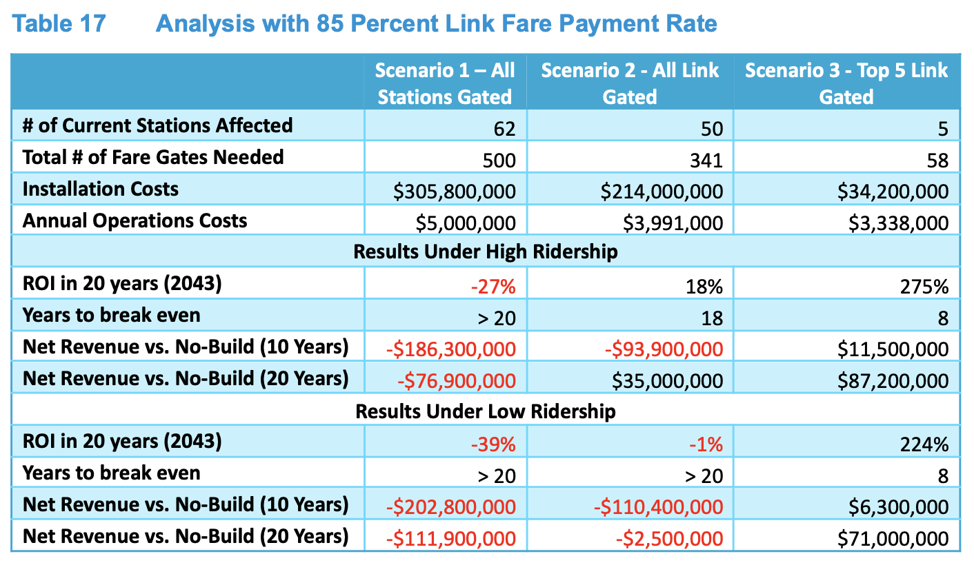 Scenarios were also tested at an 85% fare payment rate environment, prior to gating. The results of that are far less impressive with only scenarios gating the five busiest Link stations providing a marginal value for the investment.