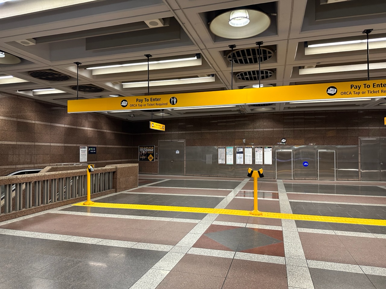 Sound Transit currently has an open, proof-of-payment fare system for its rail services, but has been moving to push fare paid zones away from Link platforms with fare payment at clearly identified zone thresholds within stations, such as Pioneer Square featured here. (Stephen Fesler)