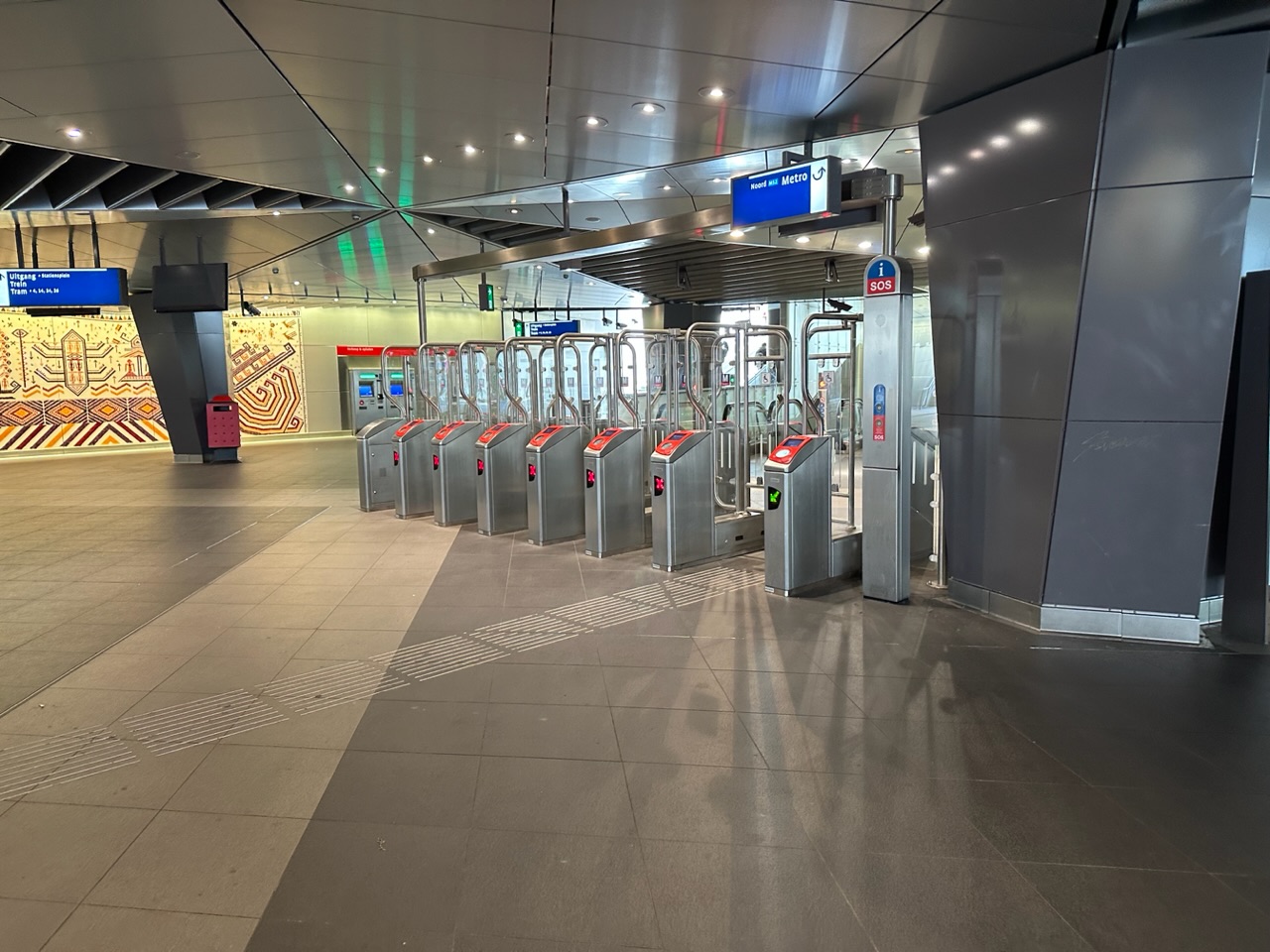 Fare gates at an underground metro station in Amsterdam. (Stephen Fesler)