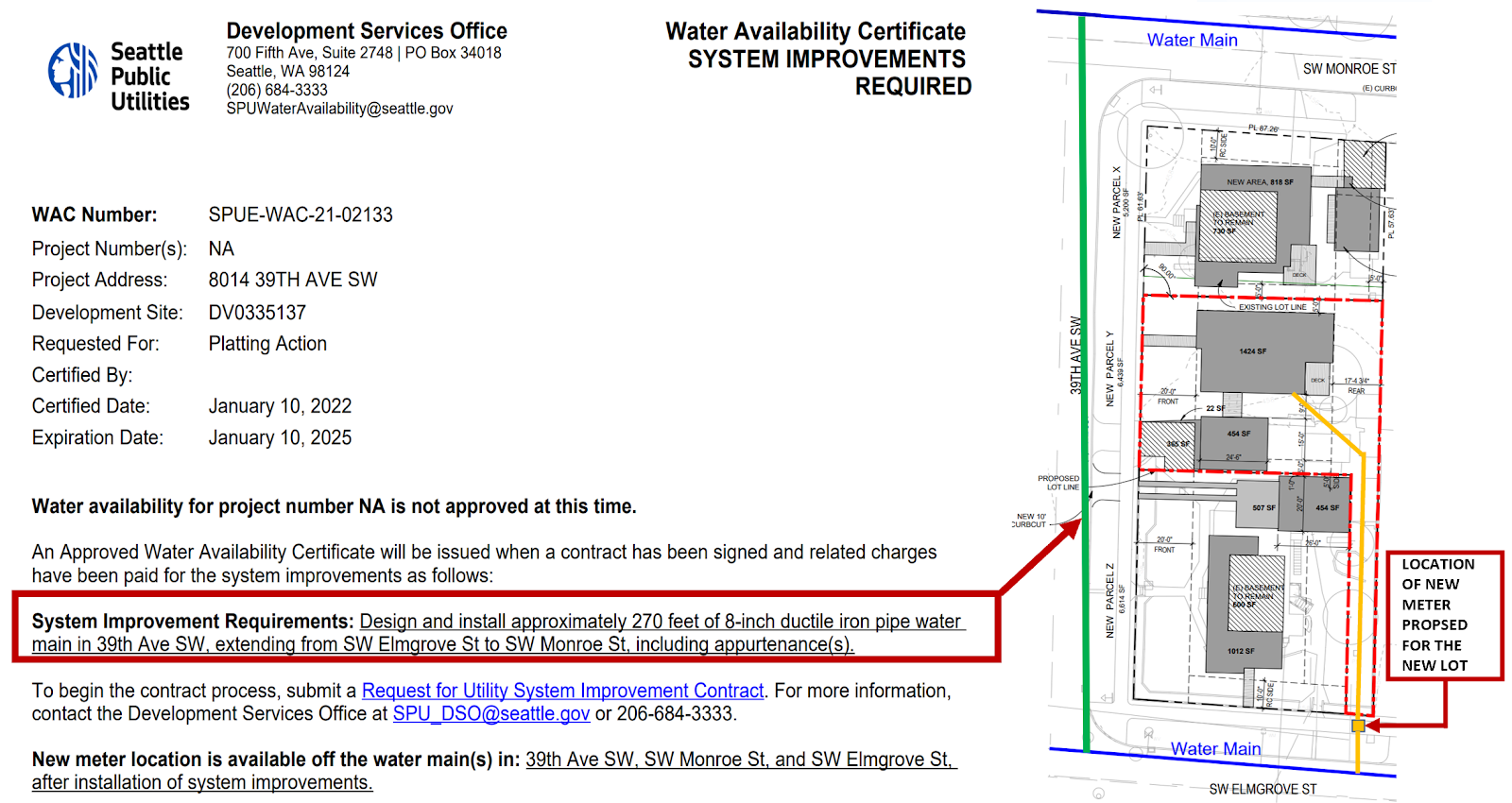 Despite the fact that an existing water main is available for the new connection, the City of Seattle issued a WAC (Water Availability Certificate) requiring 270 feet of new water main to provide a desired gridding connection between two existing parallel water mains.